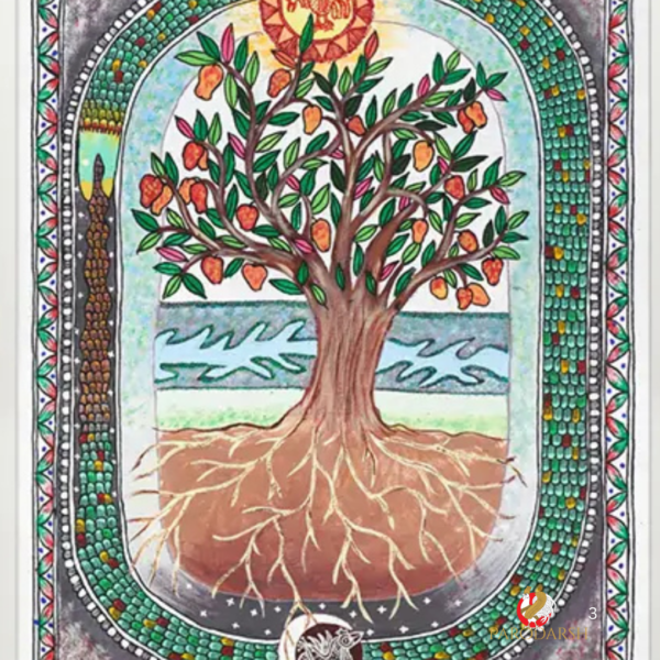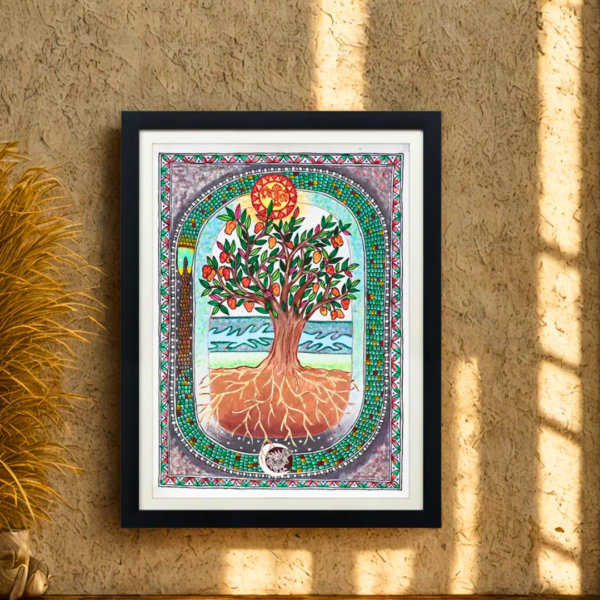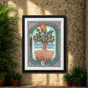 This one-of-a-kind Madhubani painting captures the Tree of Life, flanked by roosters marking the passage of time – from the golden glow of dawn to the stillness of moonlight.
