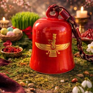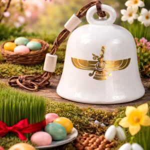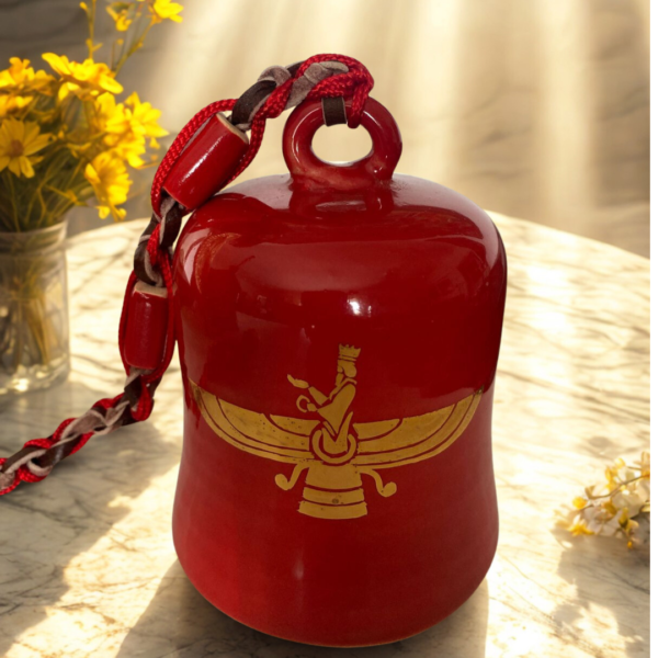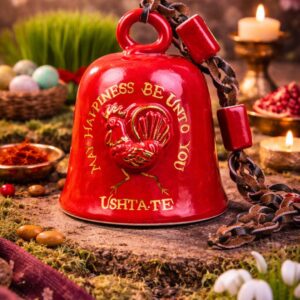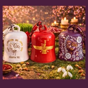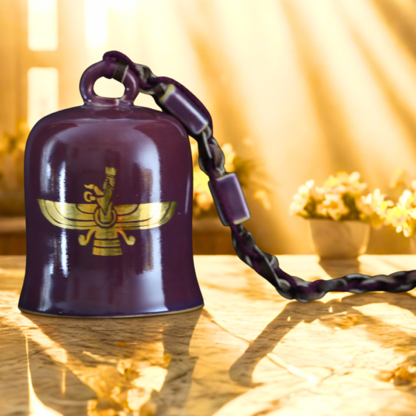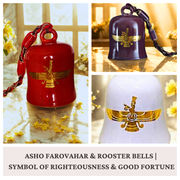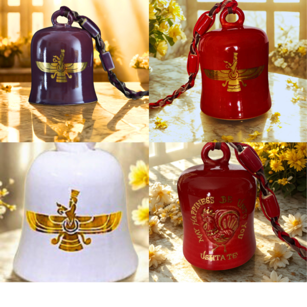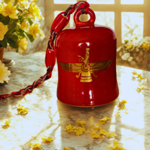 At Parodarsh, we’ve taken this timeless pairing to a whole new level. These handcrafted ceramic bells feature the Asho Faravahar—the Zoroastrian symbol of divine protection and guidance—on one side, and a glorious golden rooster on the other, representing vitality, courage, and hope.