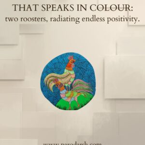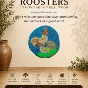 Two bright eyed Gond art roosters welcoming different directions. Don’t miss the super fine brush work behind, the hallmark of a great artist.