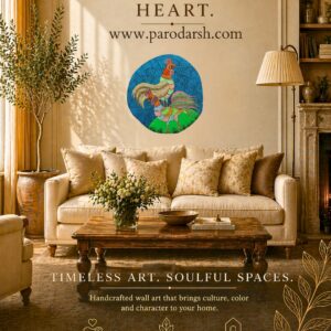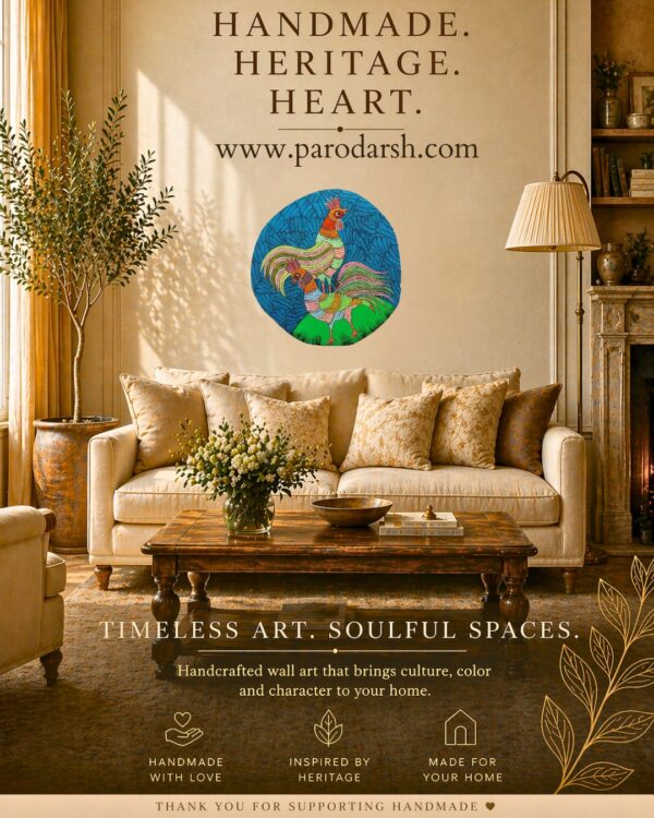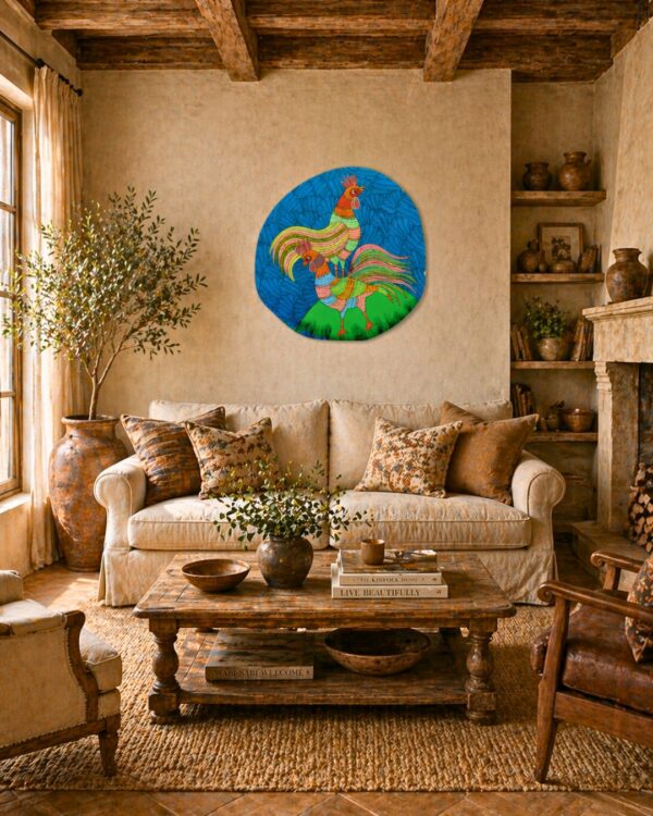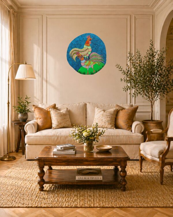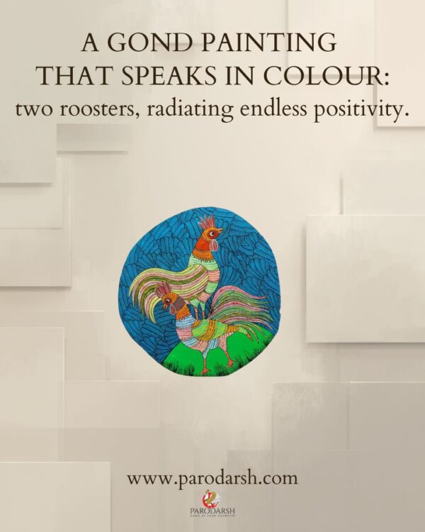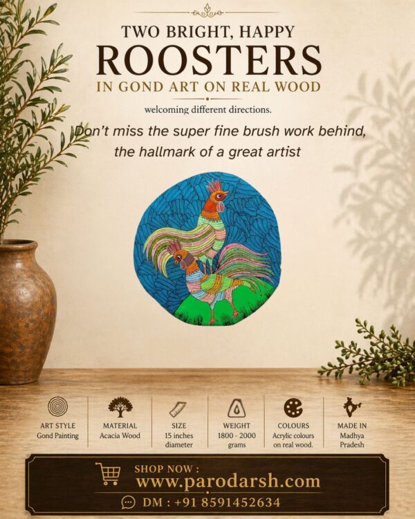 A Gond painting that speaks in colour – Two bright, happy roosters radiating endless positivity in Gond art on real wood